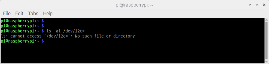라즈베리파이에서 i2c를 사용하기 위해서 먼저 터미널창에서 "ls -al /dev/i2c*" 명령어를 사용하여 i2c 디바이스 드라이버가 생성되어 있는지를 먼저 확인 해 봐야 합니다. 사용할 수 있는 i2c 드라이버가 현재는 없습니다.