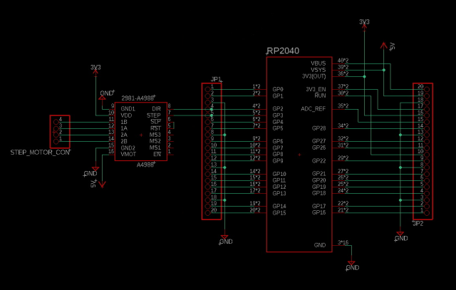생각보다 안정적으로 잘 동작되었습니다. 매번 브레드보드에 연결하여 사용하기는 어렵기도 하거니와 번거로워 쉽고 간단히 사용할 수 있도록 PCB를 제작해 보았습니다. 이글캐드를 사용하여 아래와 같은 회로를 구성하였습니다. 라즈베리파이 피코와 연결되는 인터페이스 라인은 STEP/DIR 2개의 라인만 연결되며 나머지는 모두 기본값을 사용하는 간단한 회로입니다. A4988 모듈을 사용하니 연결도 쉽고 수월하게 PCB를 제작할 수 있어서 편리합니다.
